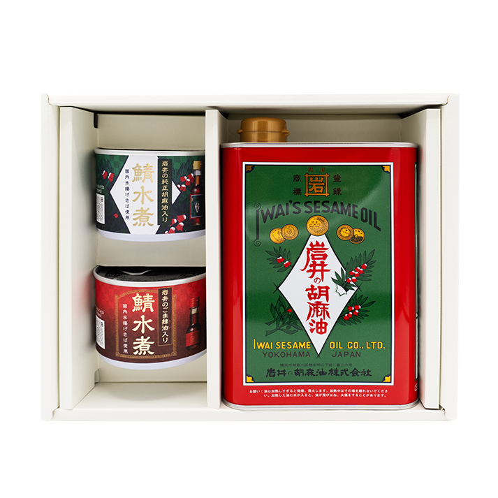 岩井の看板商品である金岩井純正胡麻油青缶と、鯖水煮缶2種をセットにしました。鯖水煮缶は銚子の缶詰メーカー「信田缶詰」とのコラボ商品。こだわりの国産さばの水煮に、岩井伝統の胡麻油と辣油を使用し、香ばしく仕上げています。